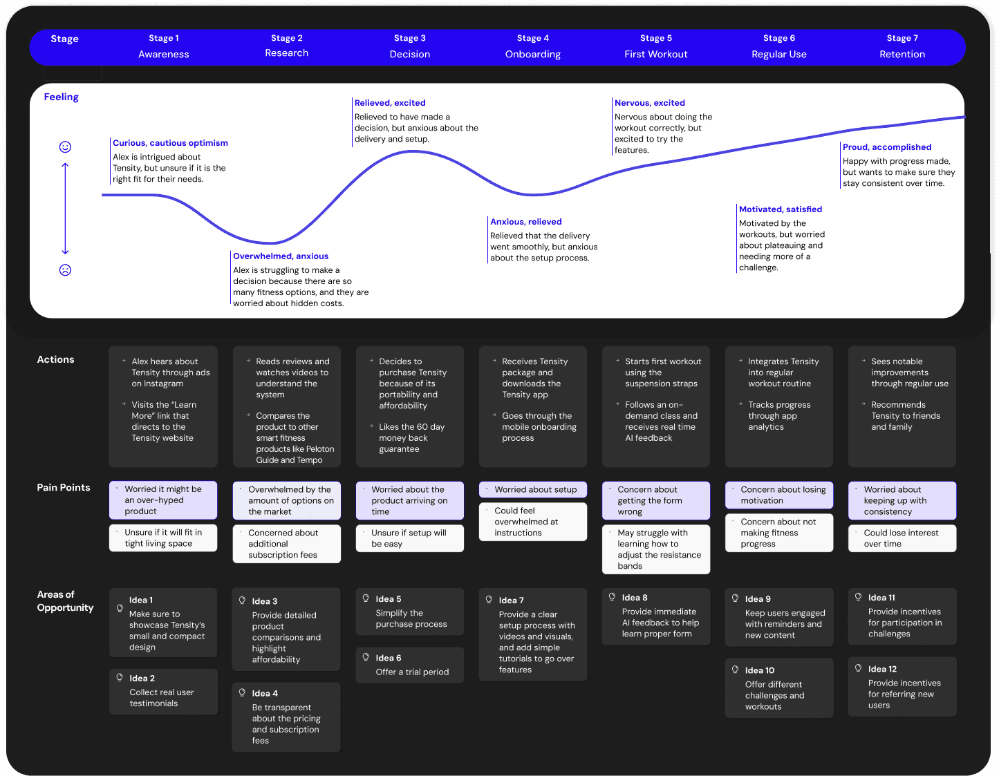 This case study outlines the development of Tensity, a speculative AI-powered fitness solution designed to deliver personalized training recommendations. The Tensity system includes smart resistance bands that measure workout metrics and utilizes your smart device’s camera for motion tracking during workouts. This enables the Tensity app to provide real-time feedback during each workout.
