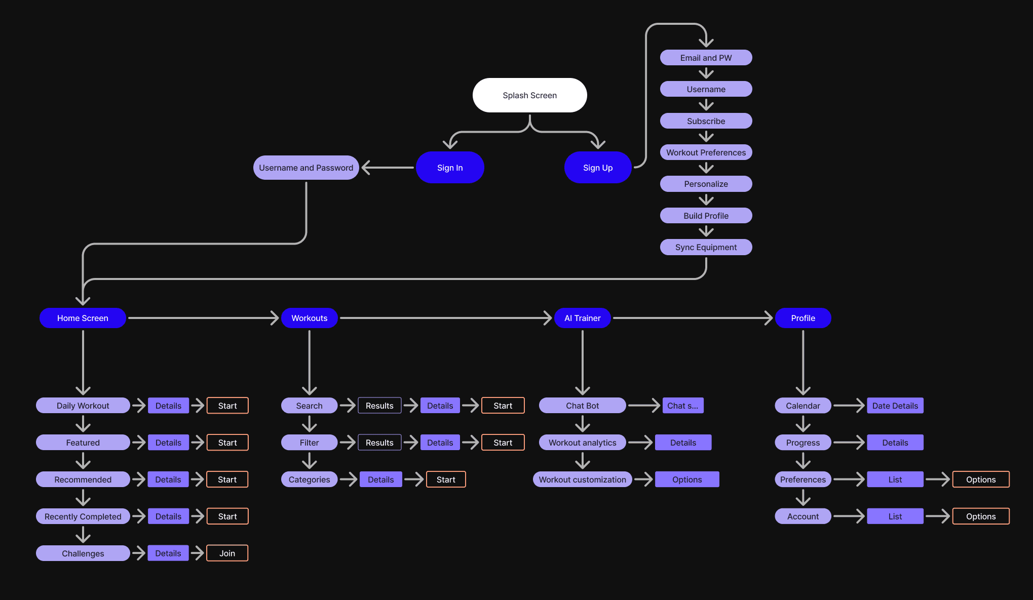To begin the design phase, I developed a site map to establish the app’s structure, focusing on intuitive navigation and content hierarchy. Using this information architecture, I created low-fidelity wireframes in Balsamiq, which allowed me to quickly create new design iterations.