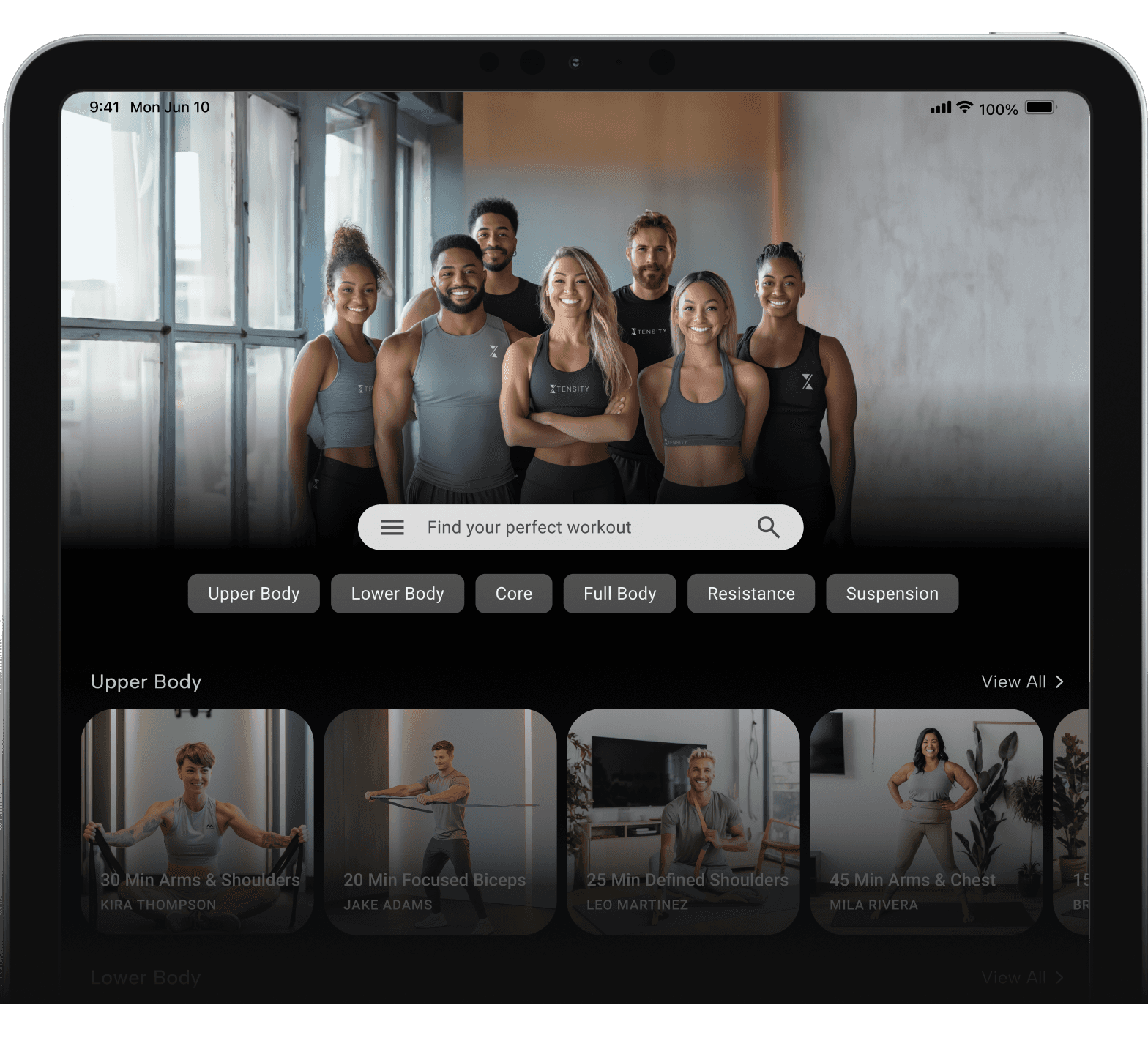 Tensity leverages the smart device’s front-facing camera for AI-powered motion tracking, while embedded sensors in the resistance bands measure the amount of force applied during a workout. This data is used to provide real-time feedback during each workout, and includes metrics such as rep count, form accuracy, and heart rate.