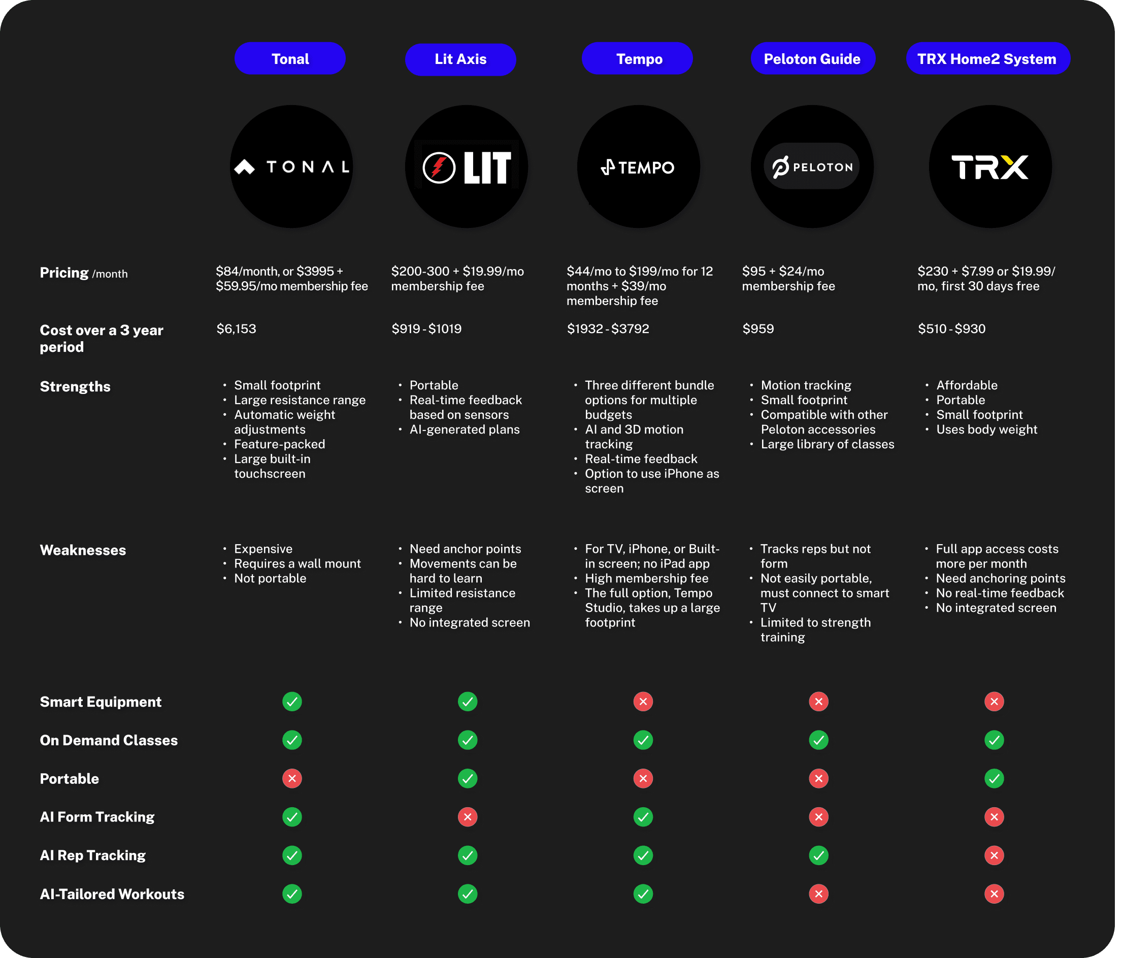 To gain a deeper understanding of the current market, I performed a competitive audit on 5 leaders in the connected fitness space. These included high-end, all-in-one systems with low to no portability (Tonal, Tempo), a TV-connected camera designed for use with free weights (Peloton Guide), and portable all-in-one solutions with fewer features (LIT Axis, TRX).